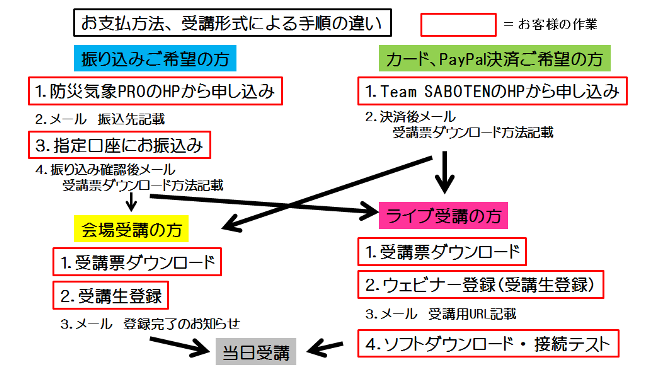 従来とはお申し込みの流れが少し変わります。受講料をお支払いただきましたら、受講票をダウンロードするURLをメールでお知らせいたします。受講票(PDF形式)をダウンロードしたら内容をご覧になり、会場受講、ライブ受講それぞれの手順で、受講生登録をしてください。お手数をおかけいたしますが、ご協力のほどよろしくお願いいたします。会場受講の方は、受講当日に受講票を印刷またはPDFの状態でお持ちください。