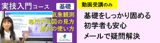 これから実技の学習を始める方や天気図を読む力がまだついていない方に、基礎をしっかり学んでいただけるようにカリキュラムを構成しています。<実技入門コース>は、典型事例を学ぶ<実技事例演習(旧強化)>に繋がる緩やかなスロープのような位置づけです。実技の一歩目でつまづかないように、講師が優しくお教えします。