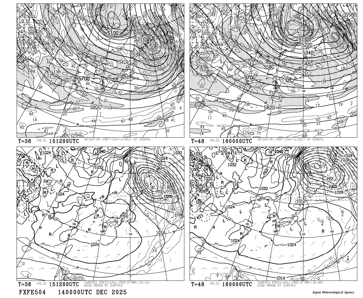 ■500hpa高度・渦度+極東地上気圧・降水量・海上風36・48時間予想図