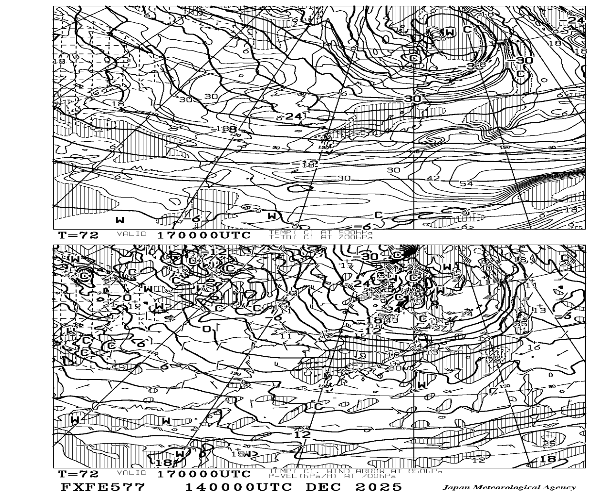 ■極東850hpa気温・風、700hpa上昇流+極東500hpa気温、700hpa湿数72時間予想図